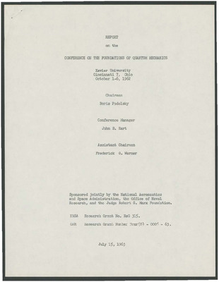 From October 1 to 5, 1962, the physics department of Xavier University hosted a Conference on the Foundations of Quantum Mechanics. The Conference was sponsored jointly by the National Aeronautics and Space Administration, the Office of Naval Research and the Judge Robert S. Marx Foundation and represents one of the most ambitious academic projects ever undertaken by Xavier. The principal participants were 6 eminent physicists, including 2 Nobel Prize winners, who were joined by 16 other specially invited physicists from around the world. Participants came from such prestigious institutions as Cambridge University in the United Kingdom, Princeton, Harvard, MIT, Yale, the Oak Ridge National Laboratory and the Jet Propulsion Laboratory in California. The correspondence pertaining to the Conference contains letters from a number of distinguished physicists including at least 4 Nobel Prize winners.