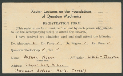 Registration form sent to and returned by participants in the Conference on the Foundations of Quantum Mechanics. This form was completed by Nathan Rosen and is postmarked September 25, 1962.